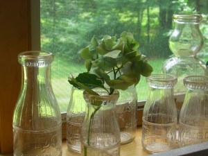 I’m playing around with herbal infusions. Steeping in the kitchen window, near the milk bottles, is peppermint oil. The other day I made two flavors of simple syrup: chocolate mint and lemon balm-peppermint. I poured some chocolate mint syrup on vanilla ice cream and that was pretty yummy. Today I mixed a shot of lemon balm-mint syrup with a glass of club soda over ice, with a wedge of lime. It tasted like a minty sprite. Yum! I think next time I’ll add a smidge less syrup and an extra wedge of lime. ( Hmm…and maybe a splash of gin. ) For everyday hydration, though, I’d better stick to the herbs in water without the sugar. :0