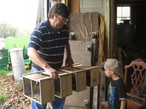 Then Harper helped PopPop gently re-insert the frames. The lids were put on the hives, and the straggler bees, who didn’t come out of the moving box, were set in front of the hives. Within an hour they all came out and made their way into the hives with the others.