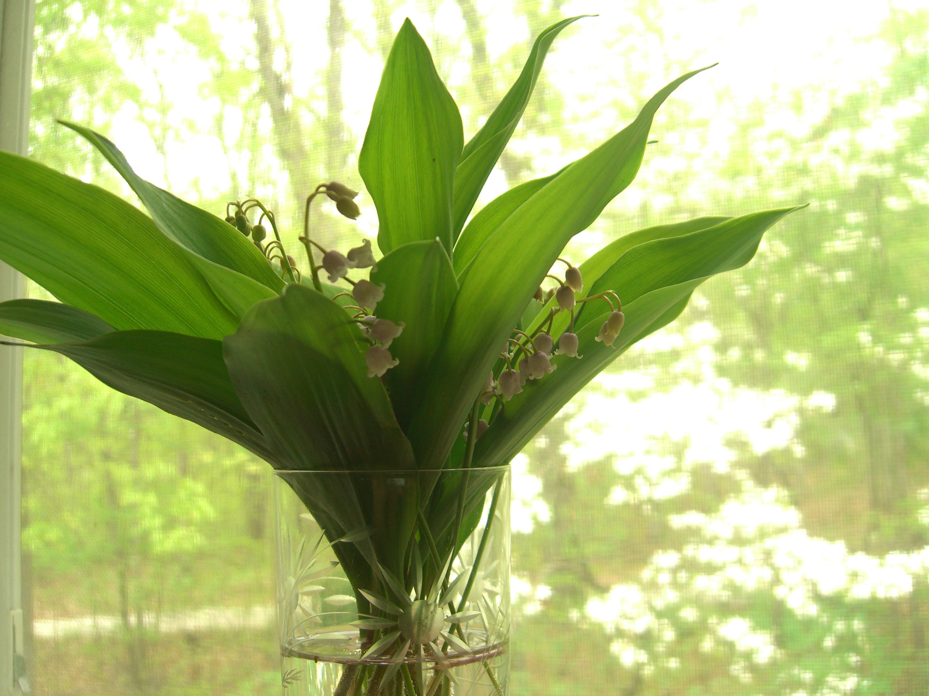 So it is May 1st. I have taken my great-grandmother’s delicately etched antique juice glasses from the china cabinet and filled them with bunches of the sweet smelling bells. My loved ones are welcome to a bouquet. Just bring your own juice glass–and a shovel.