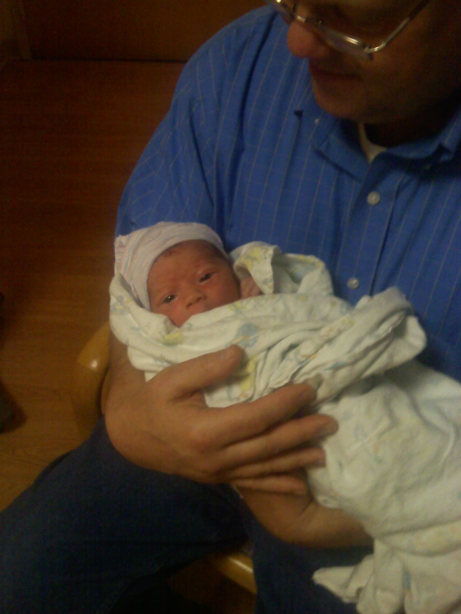 I don’t know what his delivery style has to say about his personality, but he had all of his grandparents driving back and forth throughout the night.  Mommy and Daddy went to the hospital at 8 with Kelly, the labor coach (and neighbor) par excellence.  Grandparents got there lickety-split.  And then we waited.