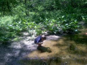 The spring-fed pool lies above the streambed in a primeval setting. On this beautiful May morning, sunlight from a clear blue sky filtered through the woodland trees to the fresh green undergrowth. Clumps of skunk cabbage with their enormous leaves dwarfed little Harper. I half expected to see a brachiosaurus come lumbering along. The pond had a little “beach” to it, which Harper promptly slipped on and gooped up the back of his pants. That didn’t stop him, though, from scooping up fistfuls of tadpoles.