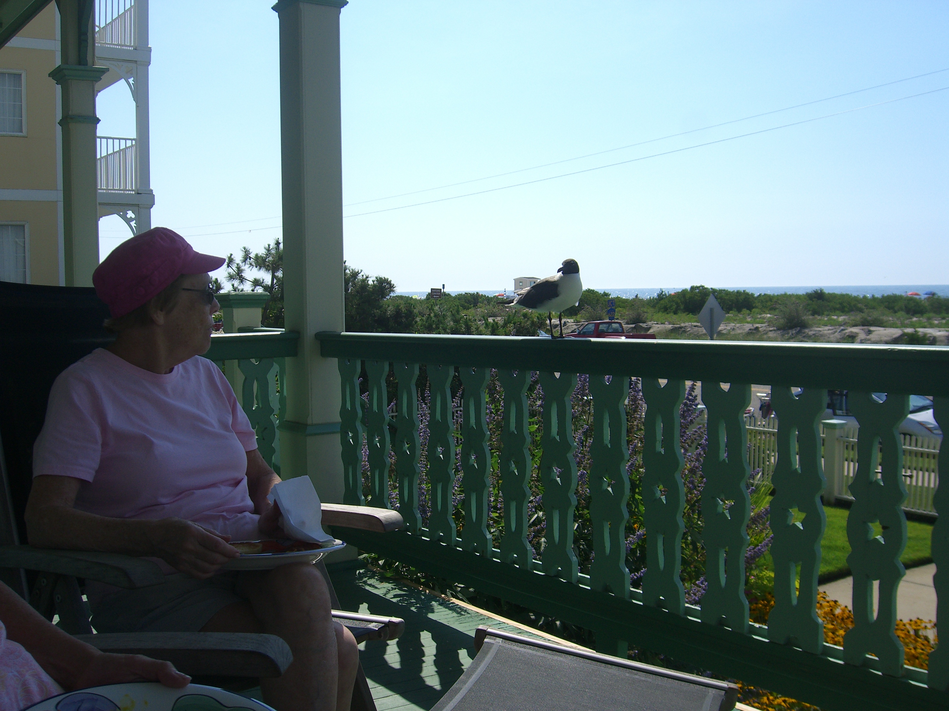 A couple of days later, I prepared my post-beach snack to enjoy on the porch. As vacationers next door sipped cocktails on the porch of the elegant Peter Shields Inn, I set out my cheese and crackers and stepped inside to retrieve my gin-and-tonic. Suddenly, a flapping of wings caught my attention. That daggone bird had sent invitations to all his friends and they were descending on my snack! In a flash, I ran onto the porch, squawking and flapping my arms.