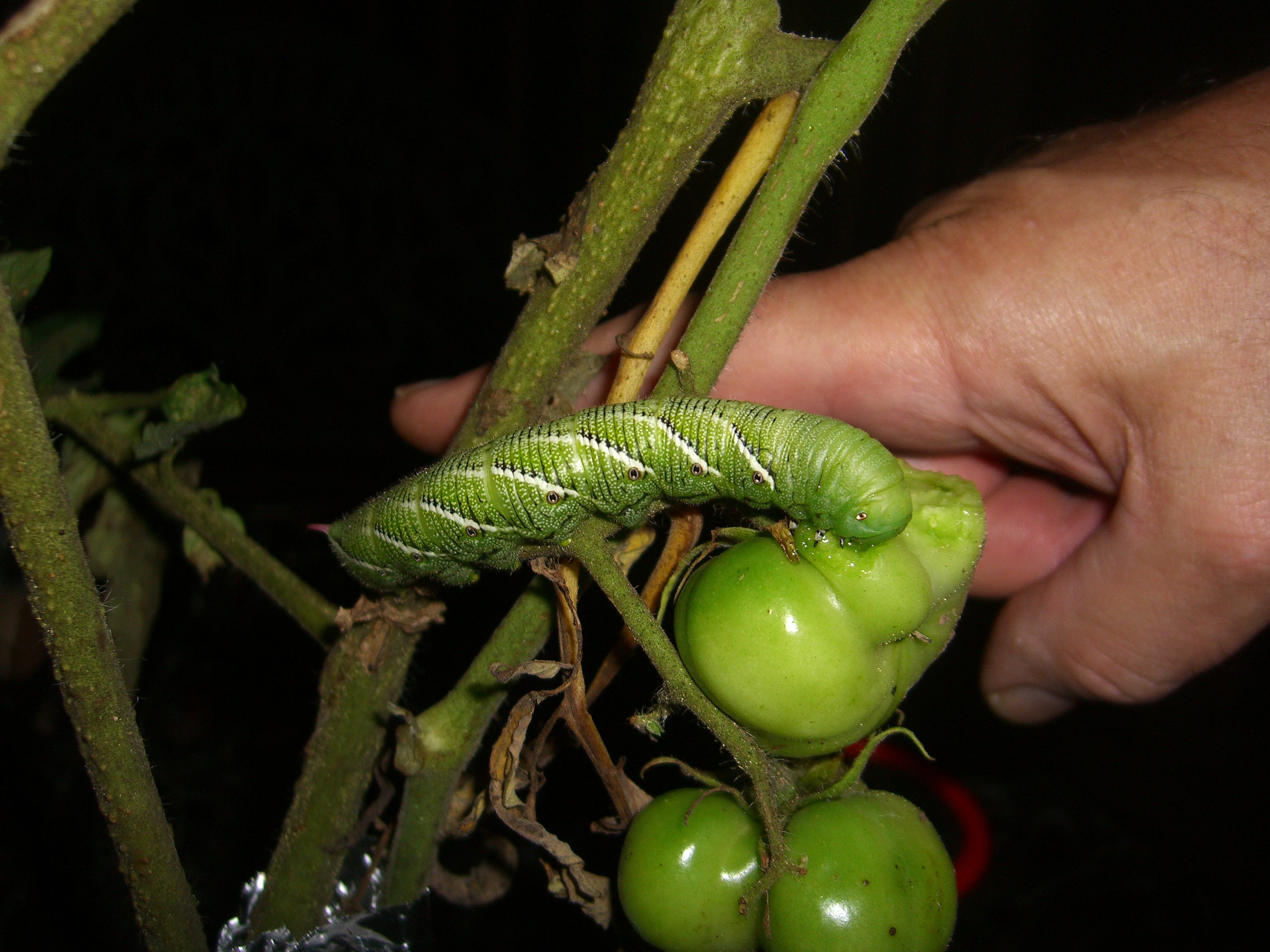 So what is it?  It’s a tobacco hornworm caterpillar.  Wait, we don’t grow tobacco.  Doesn’t matter.  It eats tomatoes, green tomatoes.  And the tomato hornworm eats tobacco.  Go figure.  It is a voracious eater and can clearly destroy a tomato garden.  Marigolds are supposed to be a natural repellant but this hornworm was on a plant growing right next to my barrier of marigolds running along the garden.  I don’t blame the marigolds.  They have been doing a great job keeping the bunnies out.  Some people with a hornworm invasion plant sacrificial tomato plants to distract the caterpillars.  Others pick them off and give them to little boys to conduct nature “experiments.”  Hmm…there’s an idea.