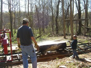 Earlier in the week, grandson helped PopPop with sawyering. That was a cleaner project–even with the tumbles into the dirt. His job was to hose off the logs and then each board as it was sawn. When not busy with the hose, he climbed all over any logs or branches he could find. He made an impromptu see-saw from a few pieces of wood. Later, he practiced his balancing by walking across logs. I pondered briefly whether he might break his arm or something if he fell, but I still managed to get distracted by PopPop cutting down a tree just as the little guy fell from his balancing post.