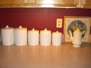 And this is exactly what I’m talking about. Of course I want the canisters. I just haven’t had time to deal with them. But now I have to deal with them because we are hosting a family reunion in a couple of weeks and John has to clean out the mudroom, where the canisters are sitting in the boxes they came in at Christmas. (Along with a lot of others things, like all his hunting gear, dead flowers, and IBM parts boxes.)