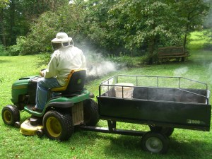 To clear out the honey box on Hive C and to clear away the cloud of Hive A bees who were looking for a fight, John used the fume board.  The fume board is a hive lid that you squirt with a nasty smelling liquid.  The bees can’t stand the smell and dive deep into the hive.  Humans aren’t too crazy about the smell either, which explains why the bottle was shipped in a bazillion layers of plastic wrap.  After a few minutes of fume board, the honey box is nicely empty of bees and John can easily remove the honey boxes and load them onto the tractor cart for transport to the house.  The fume boards get stored in the cabin where we don’t have to smell them.