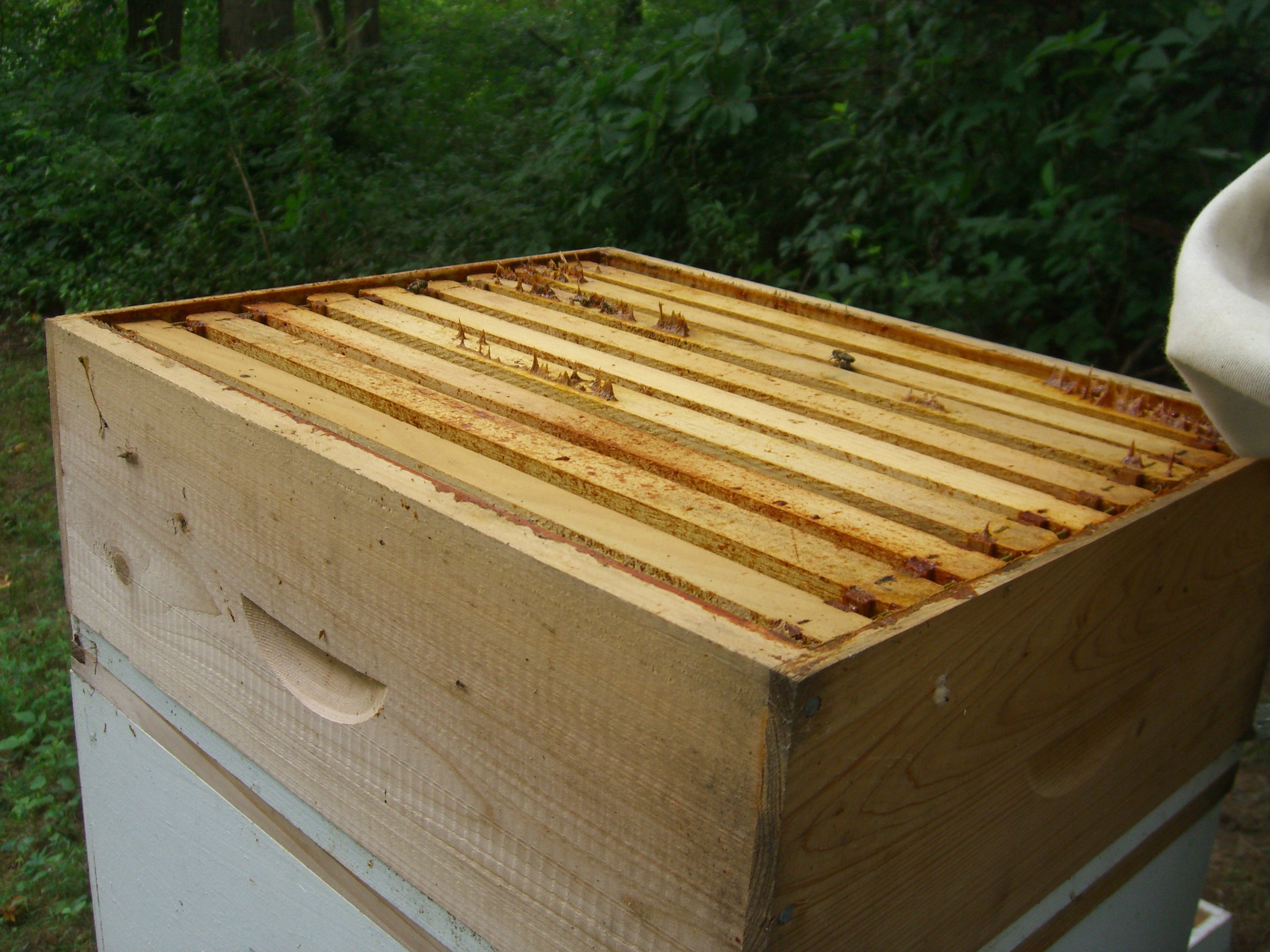Very few bees in this honey box because of an effective bee-escape