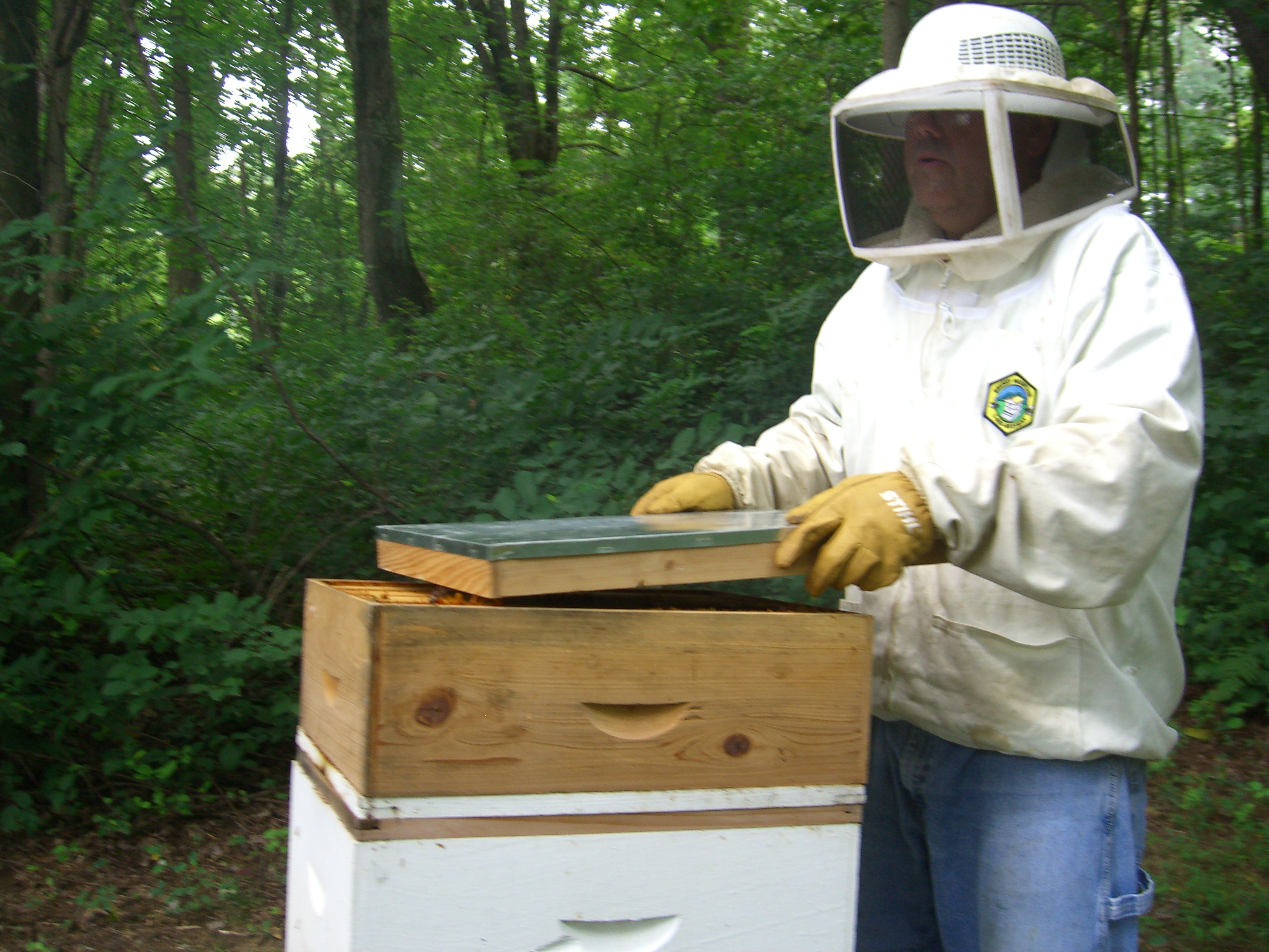 John’s pre-harvest preparations were overall pretty helpful.  The bee escapes that he put on the hives significantly reduced the number of bees in the honey boxes of Hives A and B.  Hive C still had a honey box full of bees.  John wonders if perhaps the bee escape got blocked with burr comb.  And Hive D’s honey box was empty but they had not been doing anything up there anyway.