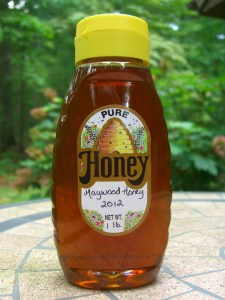 After a few days, the air bubbles settle out of the honey, my arms recover, and my order of jars arrives. Now it is time to jar the honey. An evening is spent filling the jars, writing “Maywood Honey 2012” on sixty-seven self-adhesive labels, slapping them on the jars, and wiping the stickiness away.  Stickiness, by the way, is everywhere–the jars, the counters, the floor all have a slight film of honey.  And bits of propolis, which is what bees use instead of duct tape.  Propolis on a counter can’t be wiped; it has to be scraped off.  And then you have to figure out how to scrape it off the scraper.
