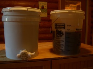 Buckets of honey waiting for jars.