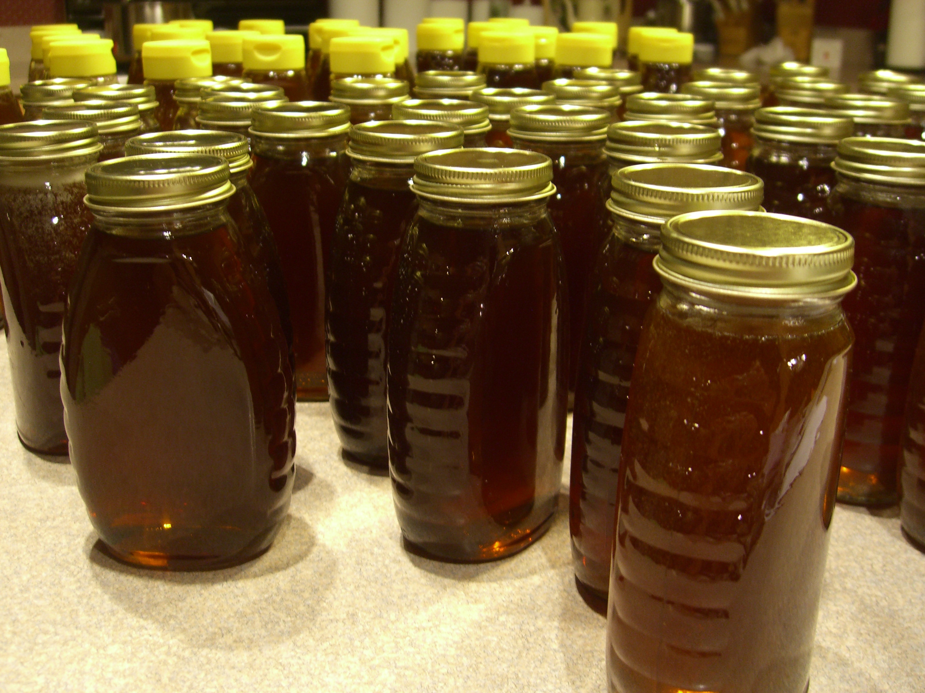If there’s anything more satisfying to a beekeeper than seeing buckets of harvested honey, it is seeing that golden sweetness in jars.  It’s a little bit  arrogant on our part to take pride in a good harvest since the bees make the honey, but there’s enough work on the part of the beekeeper to justify it.  Thousands of cranks of the honey-spinner and sixty-seven jars of honey later, we can rightly call it our harvest.  And it’s a yummy one too.