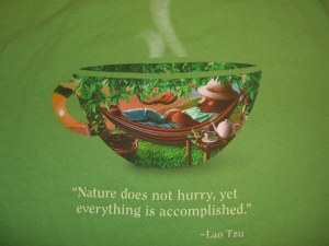 I bought a tee-shirt in June when I toured the Celestial Seasonings tea factory in Boulder, Colorado. Underneath a picture of the SleepyTime bear is the quote: “Nature does not hurry, yet everything is accomplished.” What a lovely Zen-like thought. It kind of even works as a calmness motivator–in summer. It’s pretty laughable during the school year, though, when Mother Nature calls and you have three minutes to push past pokey teenagers in the hallway to get to the restroom–and back.