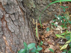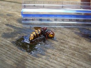 Unlike honeybees, who give their lives with a single sting, hornets can sting repeatedly and the European Hornet has a nasty big stinger. Fortunately, they are rather shy and really not aggressive–unless they are defending their nest. The problem is–we don’t know where the nest is. They nest in the woods at least six feet off the ground, but they have been known to nest in exterior house walls. At this time of year, late summer into fall, the colony could range in size from 300 to 1000 hornets. Homeowners with a nest in the house are urged to call a professional exterminator. These hornets are tricky and will create new escapes if one tries to block their entrance or spray it. The last thing anyone wants is a few hundred of these things inside the house.