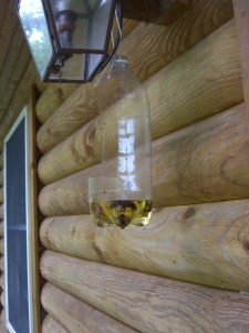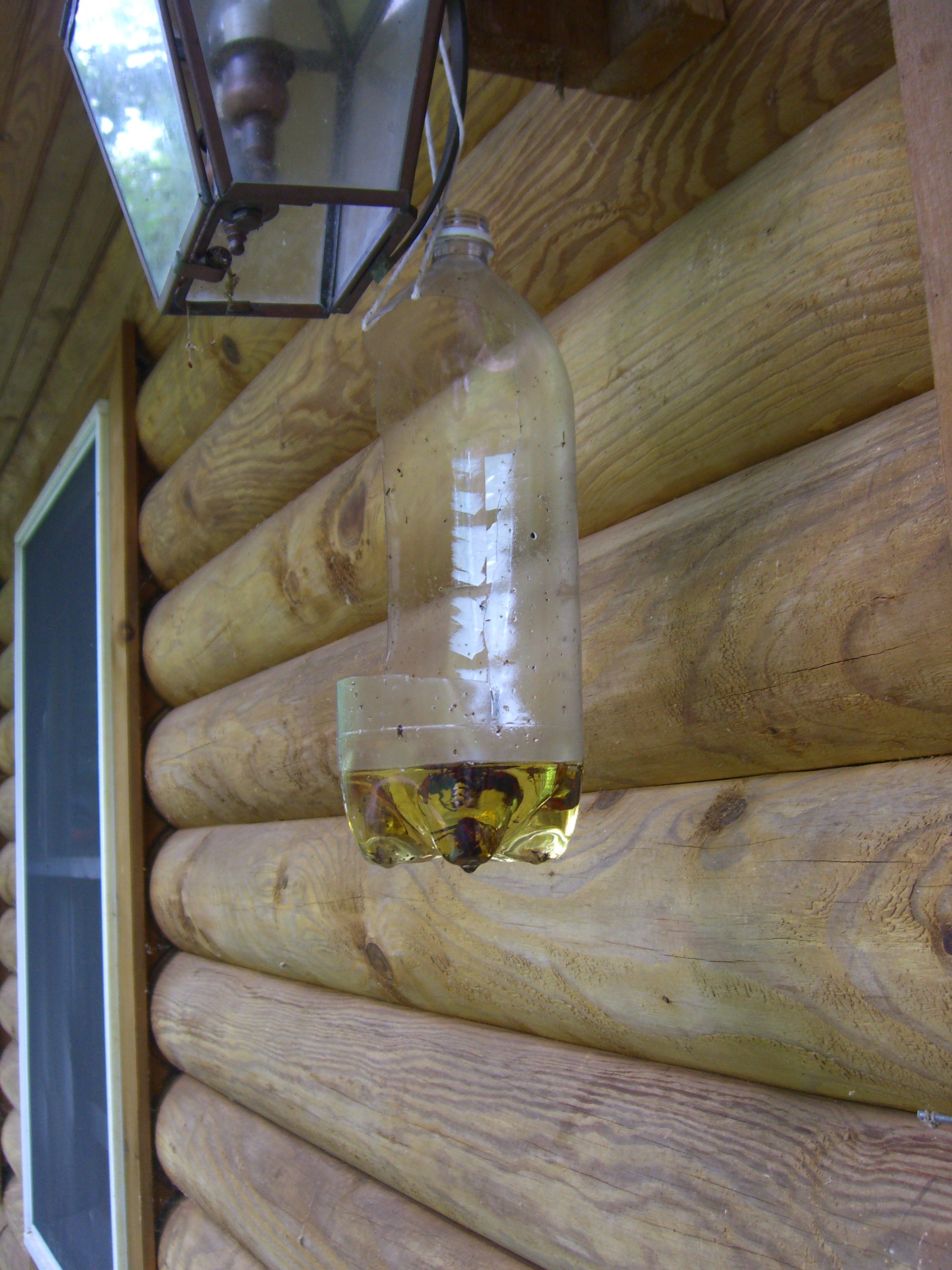 Not knowing what they are or where they nest, the best John can do is kill the ones who show up at our door. He resurrects his bug-catching invention that he devised years ago to catch live insects for our frogs Frieda and Franny. The contraption involves cutting an opening in the side of a two liter soda bottle and hanging the bottle from an outside light. The insects are attracted to the light, bounce off the soda bottle and fall in. John’s original live bug trap added an aluminum light-reflecting shield (aka, a sliced open beer can). This time we want the bugs to die. John fills the bottle with a couple of inches of vegetable oil, thinking that the bugs can drown in it.