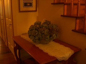 Lest you think I am overly clever, I began drying hydrangeas by accident. And often, if I am successful, it is because the magic drying fairy has taken pity on me. The first time I dried hydrangeas, I cut some flowers, put them in water in a vase and put the vase in the music room. And completely forgot about them. Um…I do this a lot. Some flowers don’t mind this. I have a vase of pretty yellow roses from my orthopedic surgeon that dried quite nicely. Usually, though, I end up with vases of dried twigs sitting in oogy water with goopy leaves. The hydrangeas, however, looked great. I decided after that to leave all the hyrangeas in their vases until dry–and I ended up with a lot of shriveled up hydrangeas.