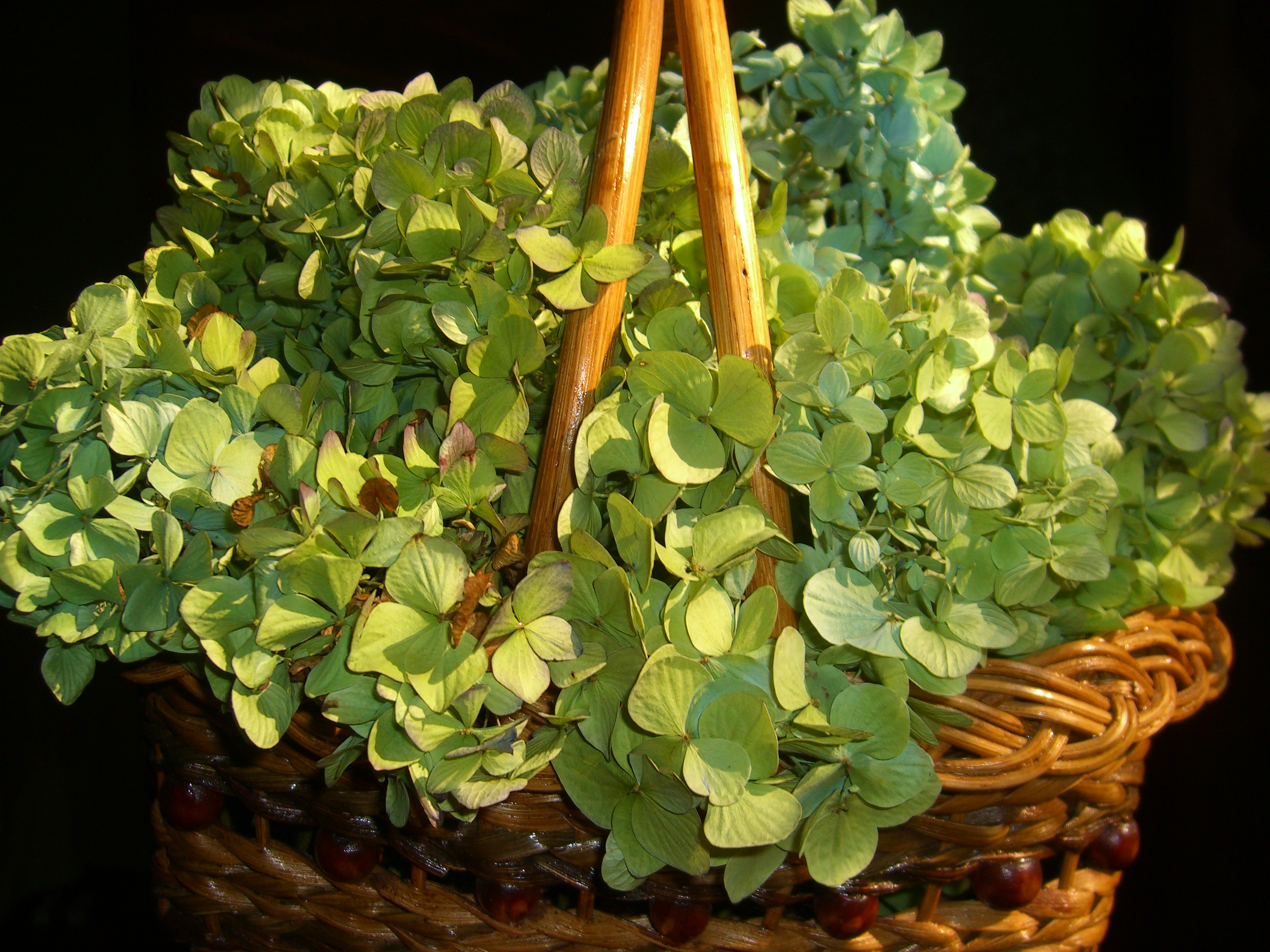 Step one is to harvest the leftover blooms. They are no longer the pure blue that inspires wedding bouquets. They are turning like leaves into autumnal hues of purple and green. They won’t go icky brown until after the first frost. Now is the perfect time to just snip and decorate with them. I cut the blossoms and arrange them right into the basket. No water. Nothin’. I put the basket in the hallway. Ta da. Done. A week later the soft autumnal flowers are dried crispy but retain the same color.