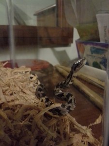 The first attempt to feed the snake was less than successful. We bought the smallest live mouse we could find at the pet store. I pitied it all the way home in the car as it stuck its little pink nose and tiny fingers out of the holes of the pet store box. But when we put it in the cage with the snake, it was pretty obvious that the mouse was more than the snake could handle. It completely ignored the snake and scampered about the cage while the snake made desperate attempts to strike at it. I had visions of finding in the morning a live mouse but a snake dead from frustration. We did find a dead mouse in the morning, but it was still just too big for the snake to eat.