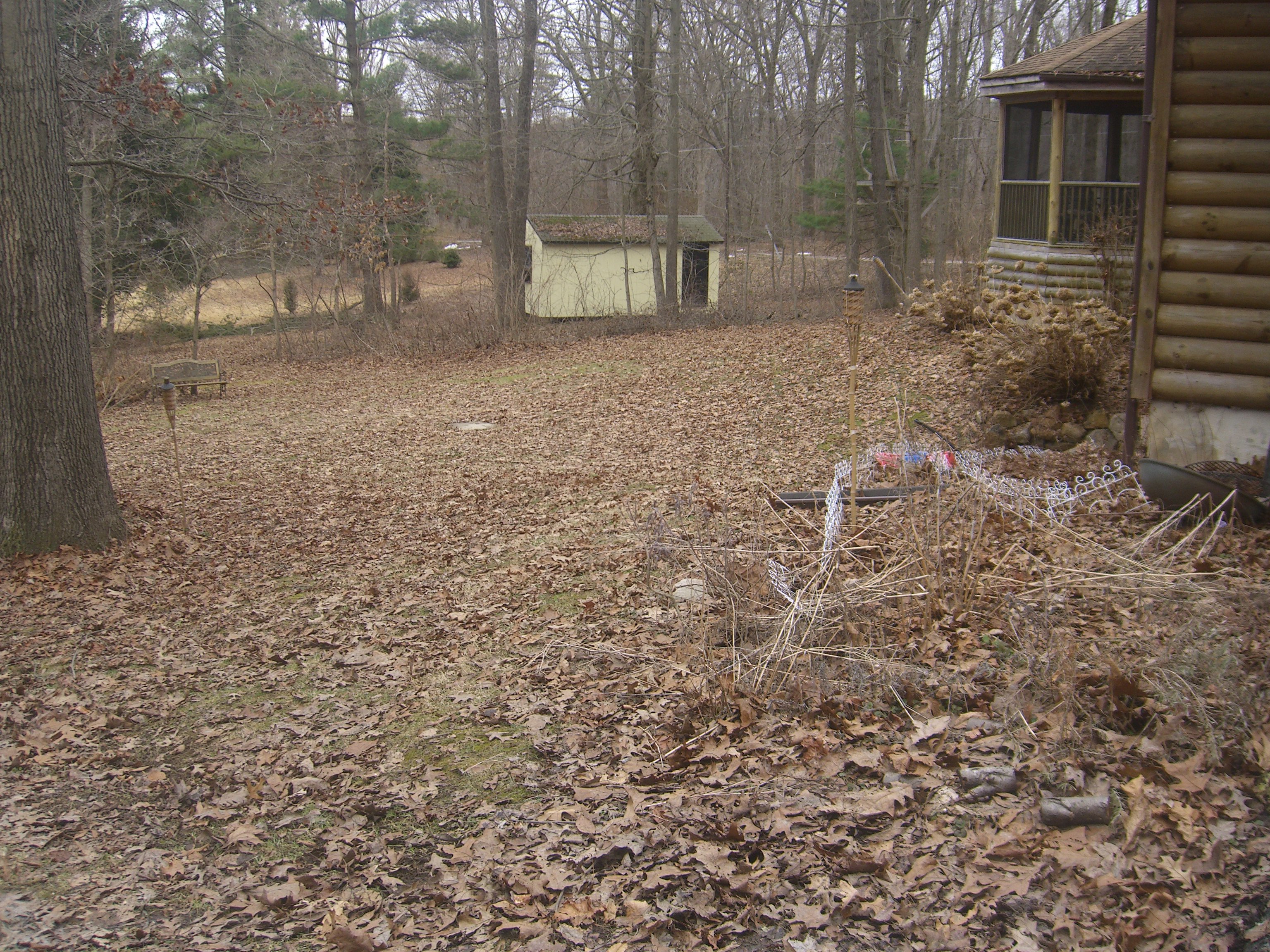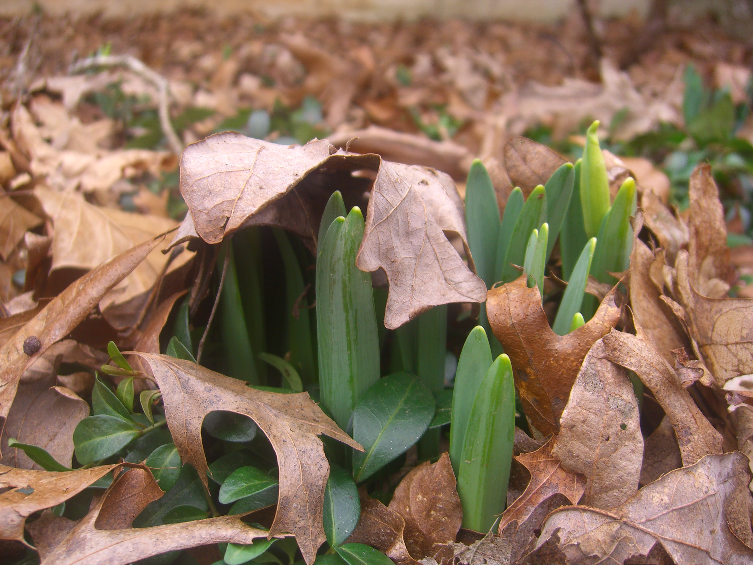 The periwinkle hides under a brown blanket of leaves until I rake it away for instant spring.