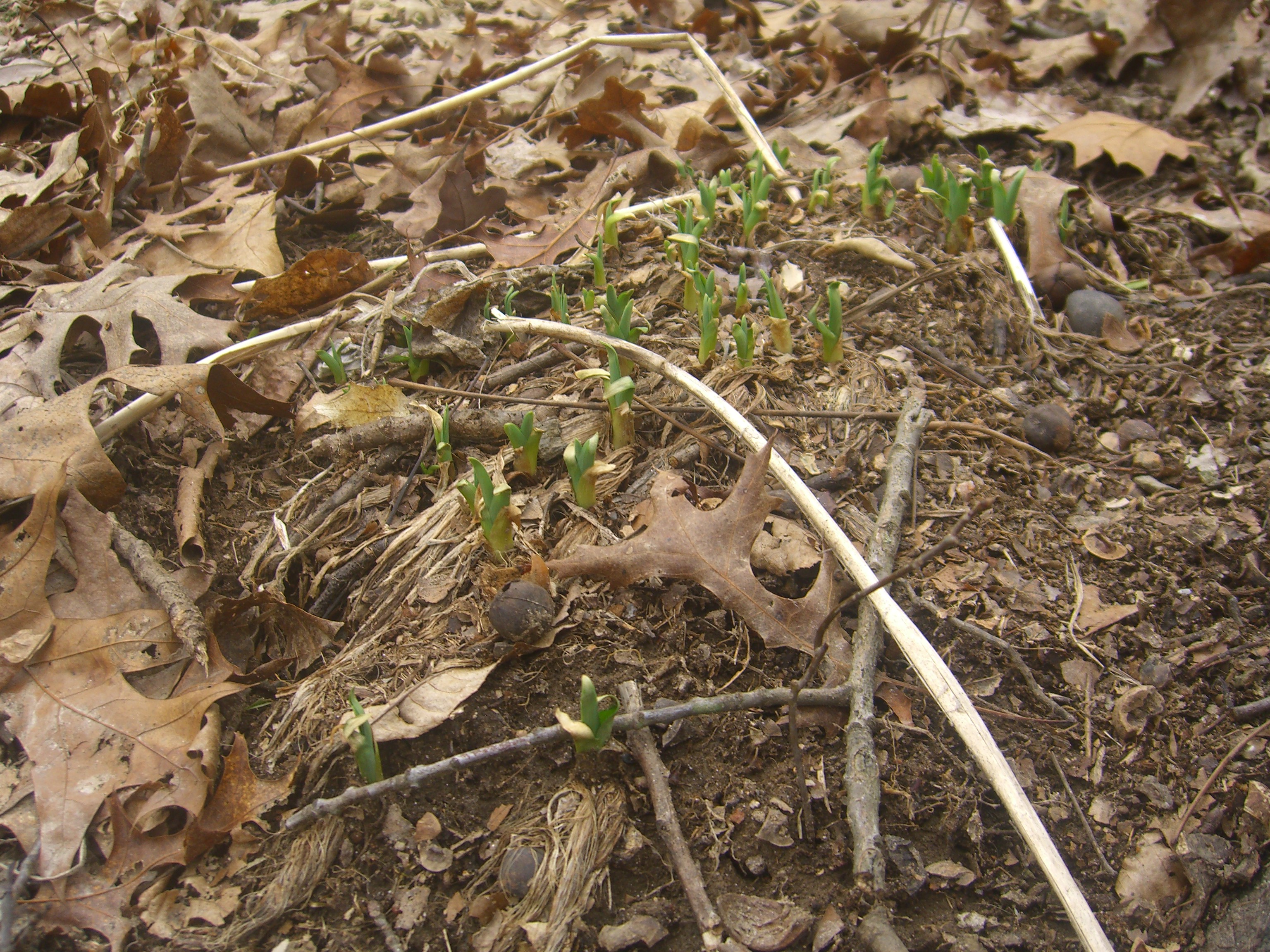 Daffodils hide with the periwinkle. They peek up tentatively. Daylilies along the windblown and heavily plowed driveway look vulnerable to the elements as they emerge. Teeny tiny promises of the lush green to come. But so tiny and cheerless. I need more green than that.