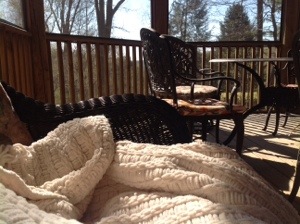 It’s a brisk morning, but delightful on the porch, where I am swaddled in a blanket, sipping hot coffee. From the comfort of my porch swing and the warmth of a sunbeam, I watch as BeeMan comes and goes from the bee yard. He is getting the hive ready for the new bees.