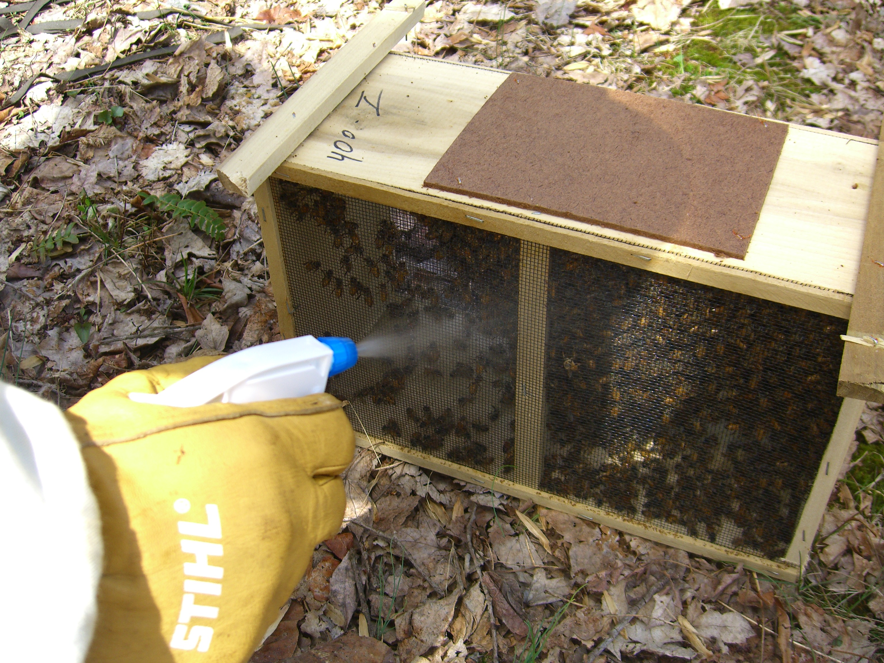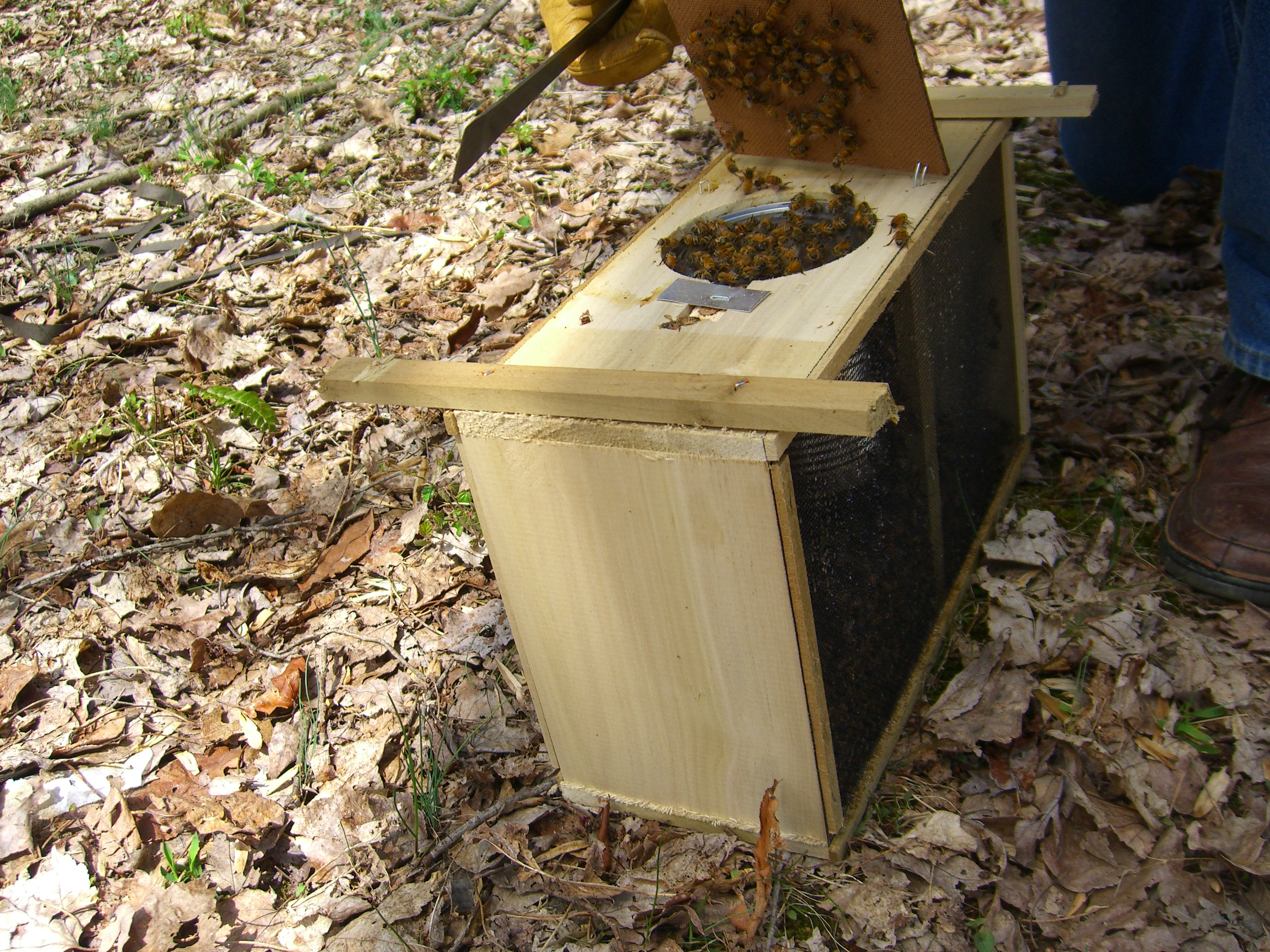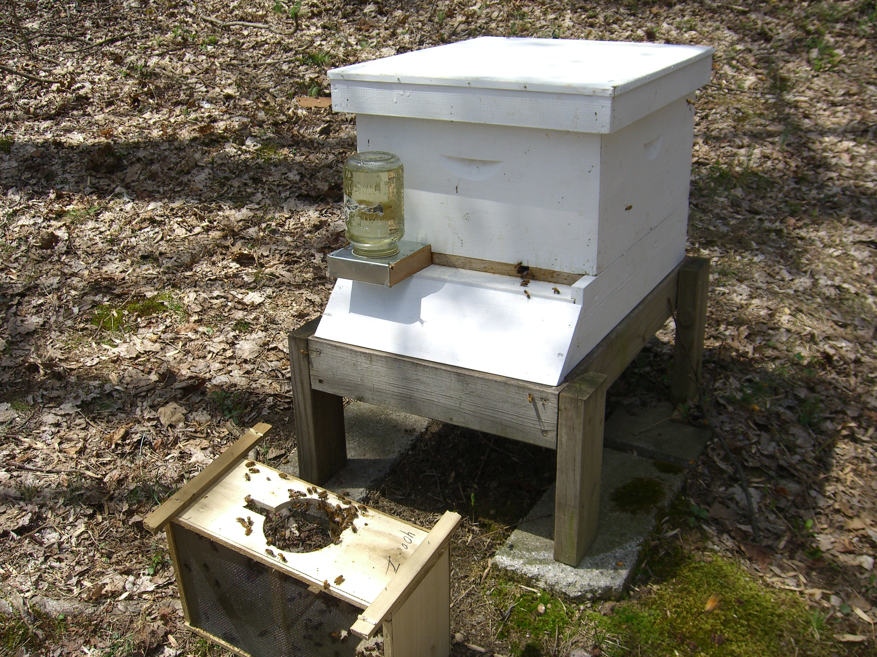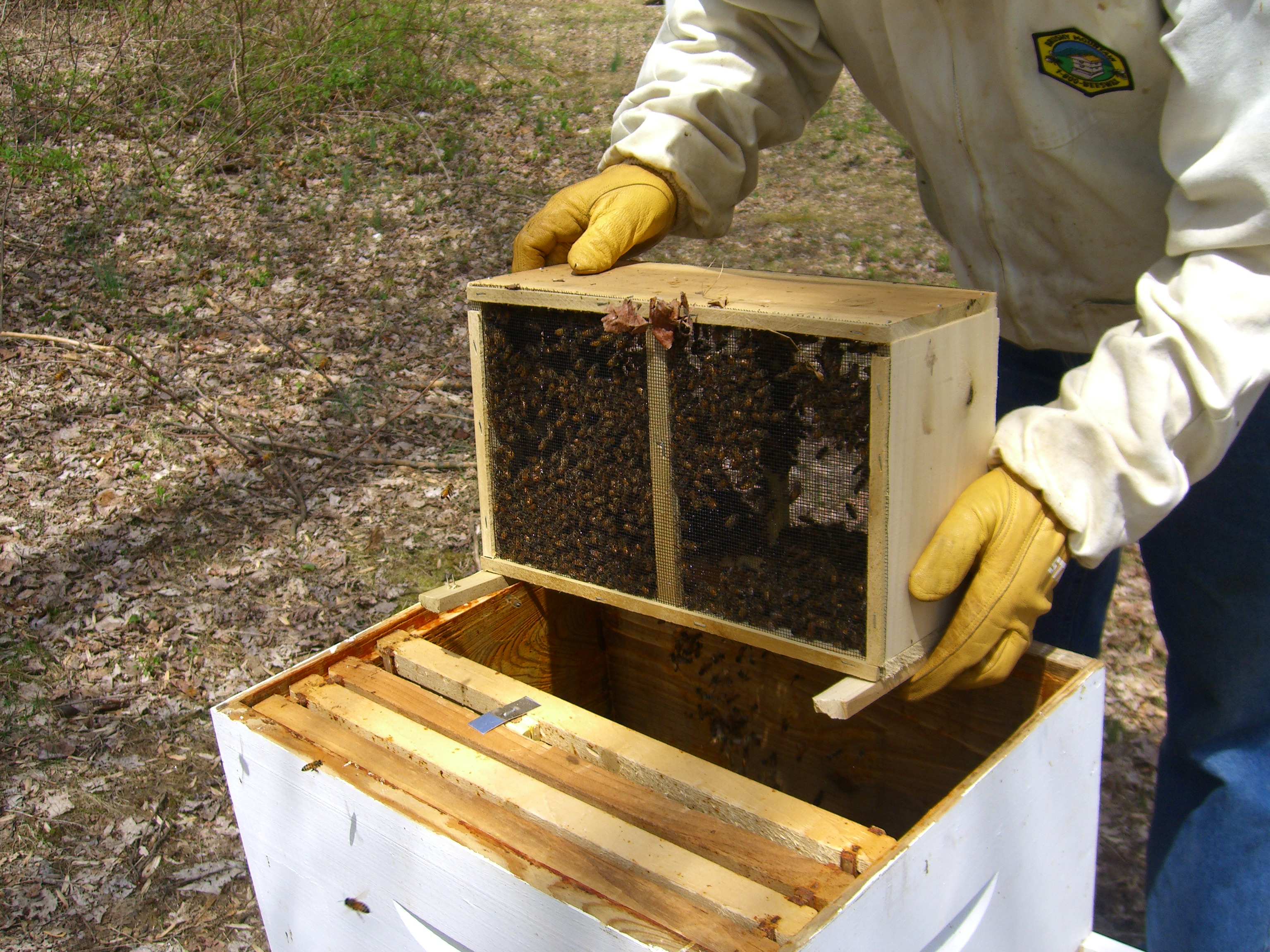 As the sun rides high in the sky, we don our bee gear and take the Newbees to their new home, Hive A. It doesn’t take long to dump them in and set up the sugar water feeder to get them started.