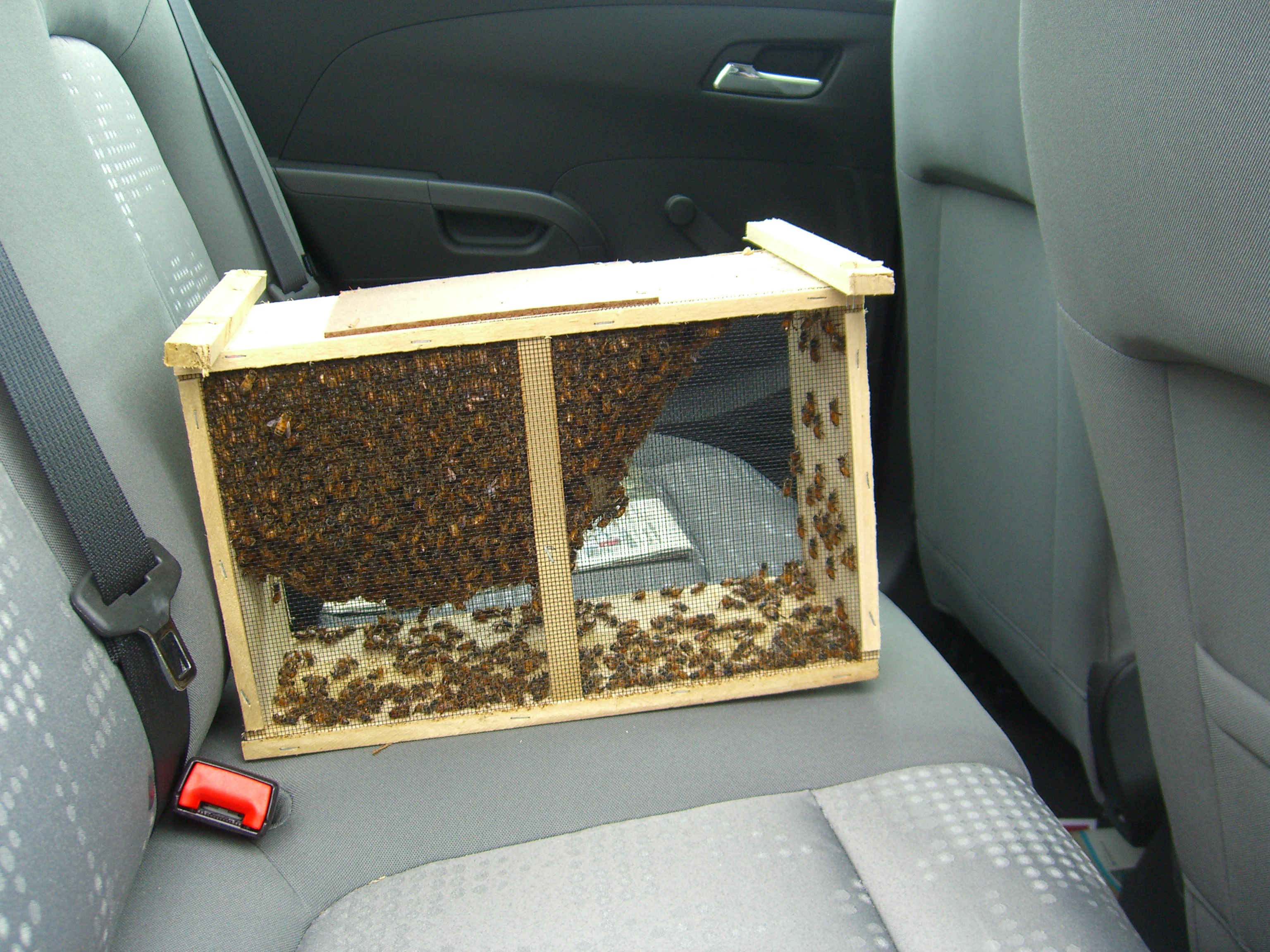 How does one bring home four pounds of bees? In the back seat of the car. We probably should have buckled them in. The box fell over on sharp turns, so I had to hold it straight for most of the ride home.