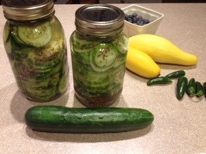 We picked four pickle cukes the day before vacation and immediately made two jars of pickles. One jar was gobbled on vacation and the other when we got home. But we came home to eight cukes plus about four that my in-laws saved for us with our mail. (That does not include the ones they ate while we were gone.)