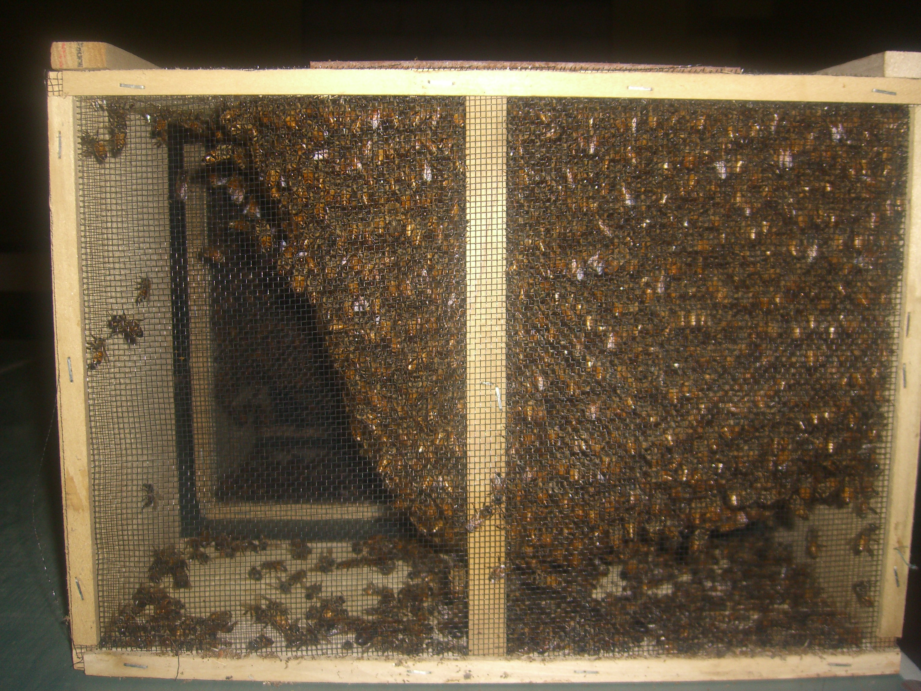 Conditions downstairs are almost ideal. The mancave is heated only by a woodstove. With no fire going, the temp is 55. And the only light is from the door. With the overhead lights off, it is both cool and fairly dark. A few bees buzz at the screens of the boxes but, for the most part, the bees quietly huddle around the caged queen and a can of sugar water.