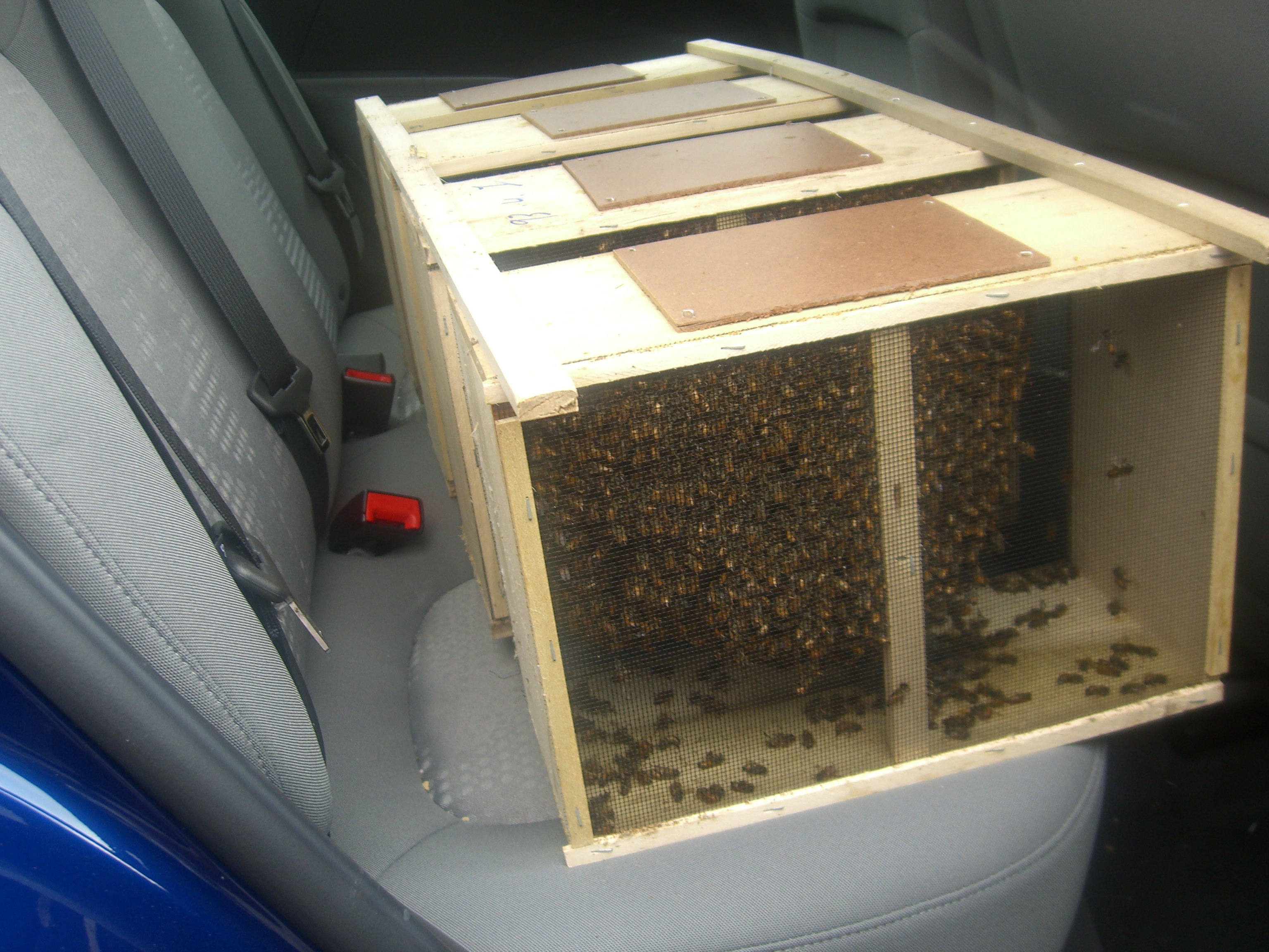 Junior Beekeeper comes with us this morning. He helps carry the bees to the car. They take up the entire back seat. A few Klingons (“cling-ons”) try to hitch a ride too, but without the advantage of the warm group hug in the bee boxes, they won’t last long. Sure enough, back home, when the boxes are removed from the car, a few motionless bees remain on the back seat.