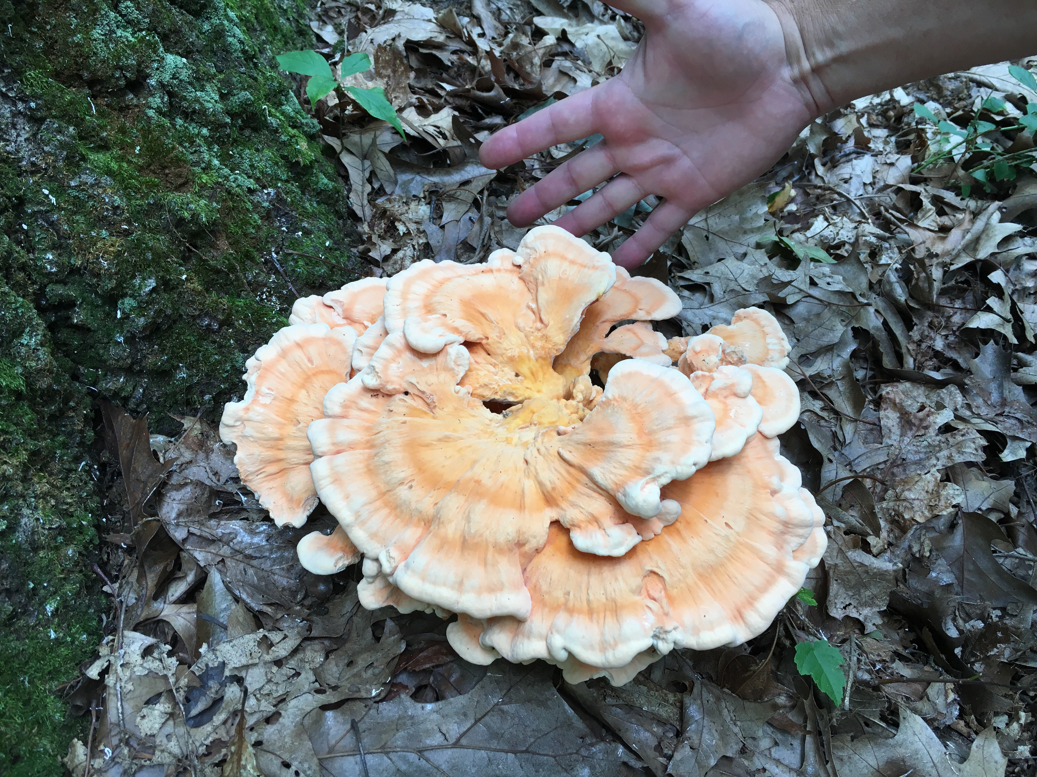 Walking back to the ‘shroom for more photos, I spotted another mushroom along the drive. After having researched the hen, I was pretty sure I was now spotting a chicken! A chicken of the woods mushroom.