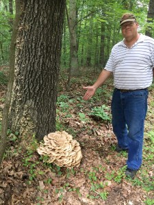 The first is growing near the mailbox. We contacted our chef buddy who contacted his mushroom buddy who believed that we have a hen of the woods. Mushroom connoisseurs go crazy over these. One hen-lover makes special lasagna with it—one to eat now and one to freeze for later. Hen of the woods mushrooms grow at the base of dead oak trees. Sure enough, this one is at the base of a dead oak tree, and two more are growing on the other side of the tree. The hen is a fall mushroom and can be found as early as late August after heavy rain. It is not quite mid-August here but it has been unusually cool and wet…as our flooded basement can attest to. They often re-appear in the same location year after year. Hmm. So maybe we now have a morrel location in the spring and a hen of the woods location for the fall?