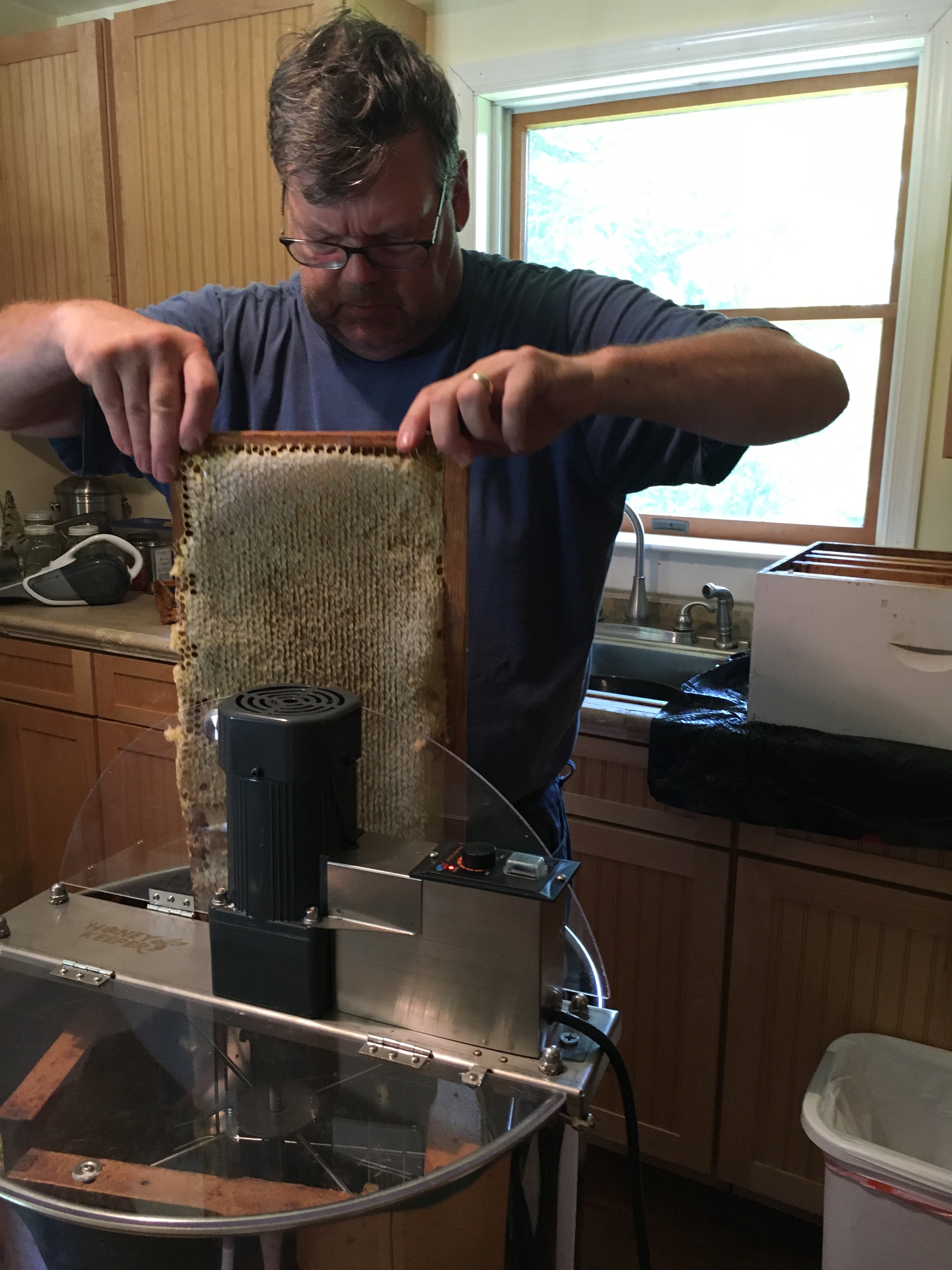 We pulled four frames of honey today. They were capped and we are so afraid that the local bear will defeat our electric fence and get to the hives again that we decided to pull some honey as soon as possible.